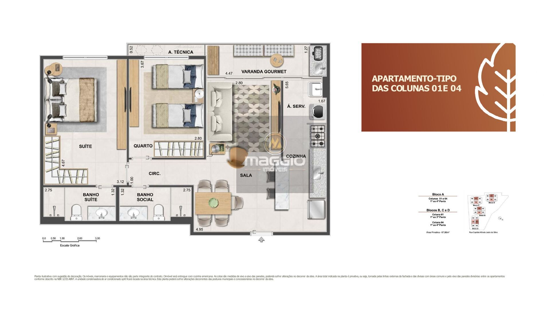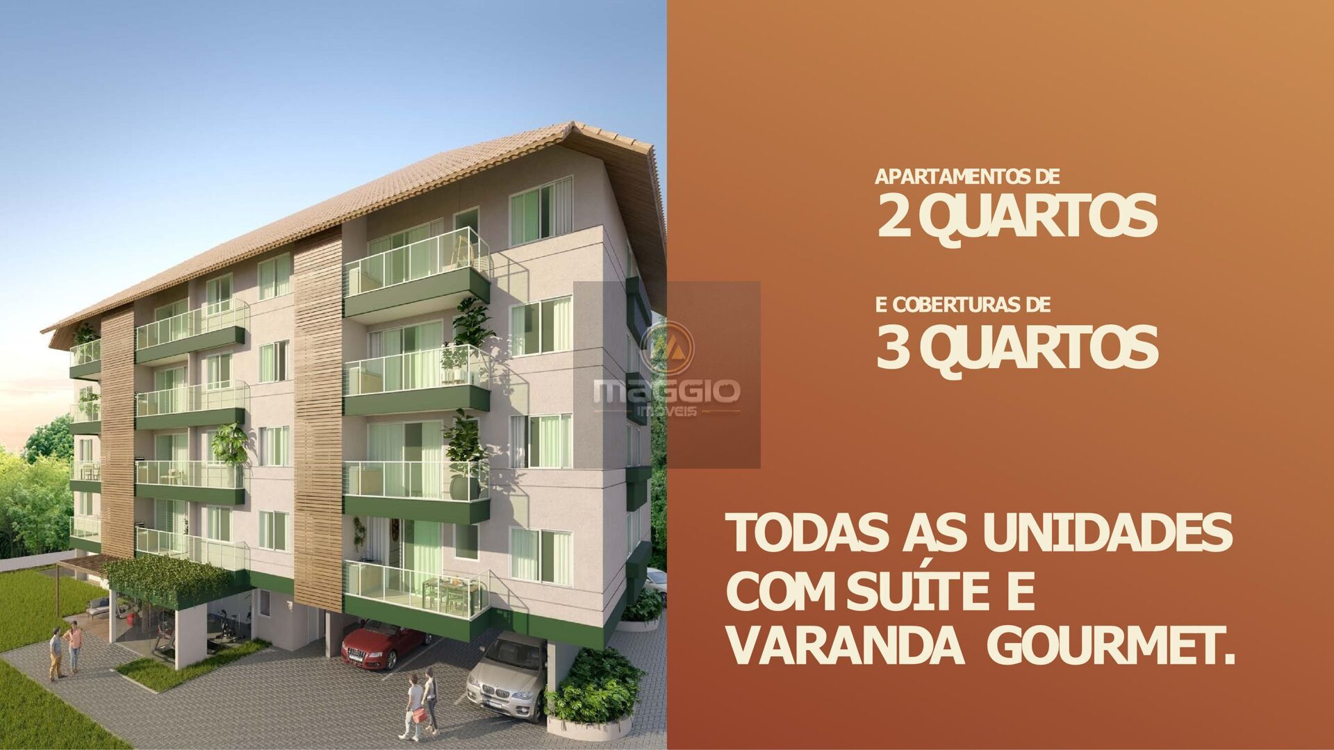 ● Apartamentos de 68 m²: 2 dormitórios (1 suíte), varanda gourmet com churrasqueira e 1 vaga de garagem.